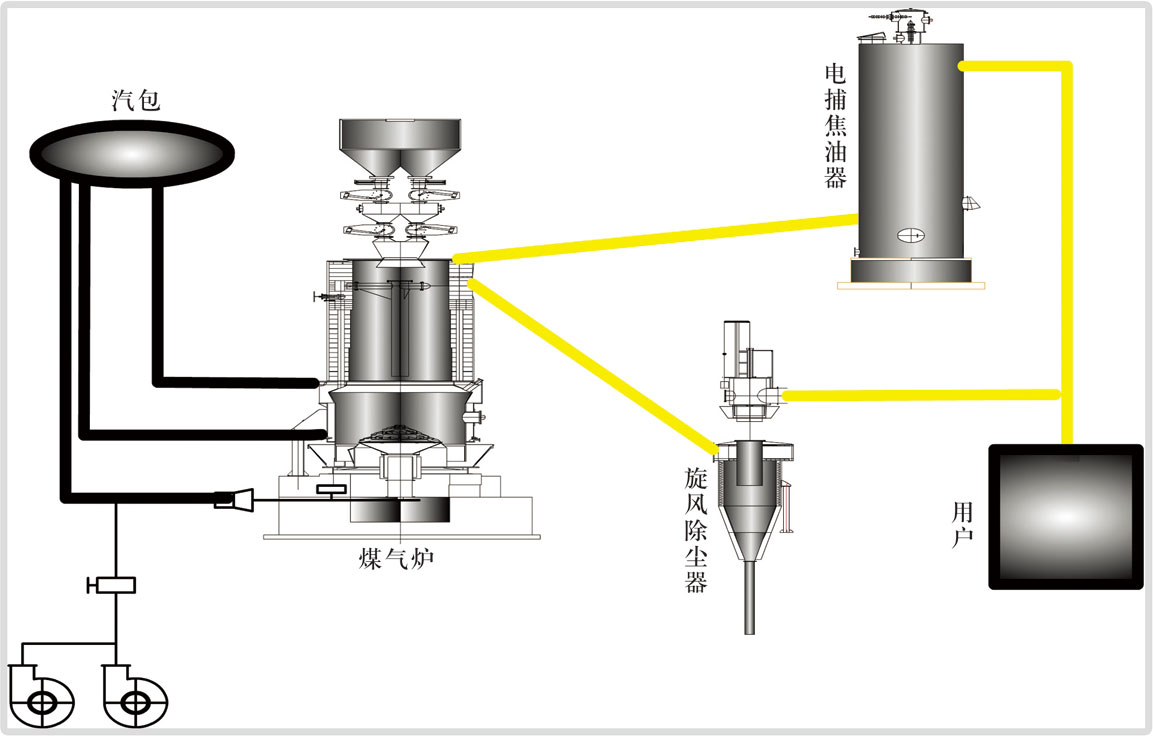 煤氣發生爐是將煤炭轉化為可燃性氣體——煤氣(主要成分為CO、H2、CH4等)的生產設備。工作原理為:將符合氣化工藝指標的煤炭篩選后,由加煤機加入到煤氣爐內,從爐底鼓入自產蒸汽與空氣混合物做為氣化劑。煤炭在爐內經物理、化學反應,生成可燃性氣體,上段煤氣經過旋風除油器、電捕器過濾焦油.下段煤氣經過旋風除塵器清除灰塵,經過混合后輸送到用戶使用。